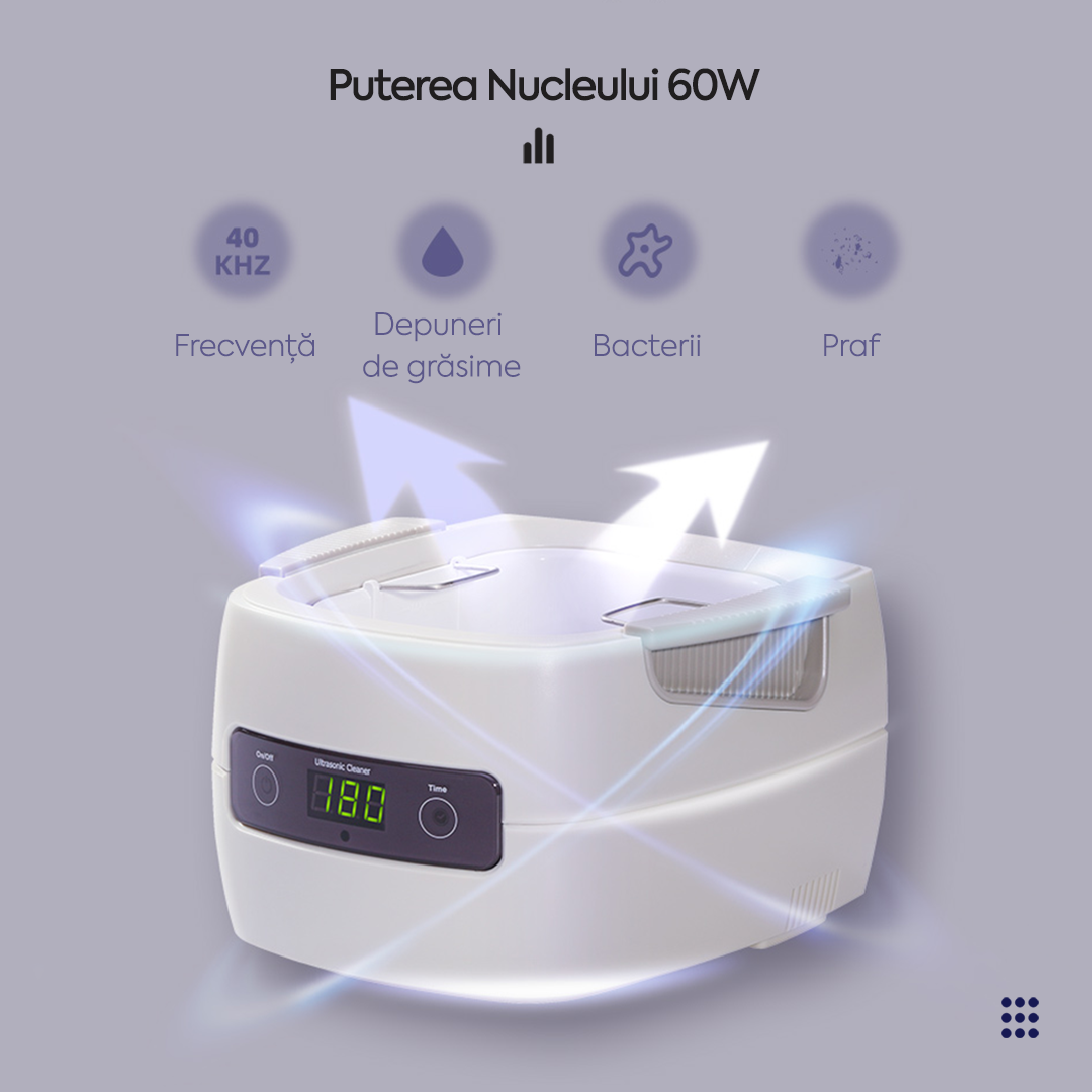 Aparat de curățare cu ultrasunete CODYSON CD-4801, 1400 ml pentru curățare presterilizare. Vasul de curățare este fabricat din oțel inoxidabil. Volumul vasului este de 1400 ml (volumul maxim pentru lichide - 1100 ml). Control digital și display LED. Temporizator: 1,5 minute, 3 minute, 4,5 minute, 6 minute, 8 minute. Dimensiunile vasului de curățare sunt 23.0 x 18.5 x 16.0 cm. Greutatea este de 1.70 kg. Această versiune are integrat un transductor ultrasonic - clasă industrială, cu un sistem de răcire ceea ce-l face potrivit pentru funcționarea continuă și îi asigură o durată de viață de două ori mai mare comparativ cu modelele obișnuite.