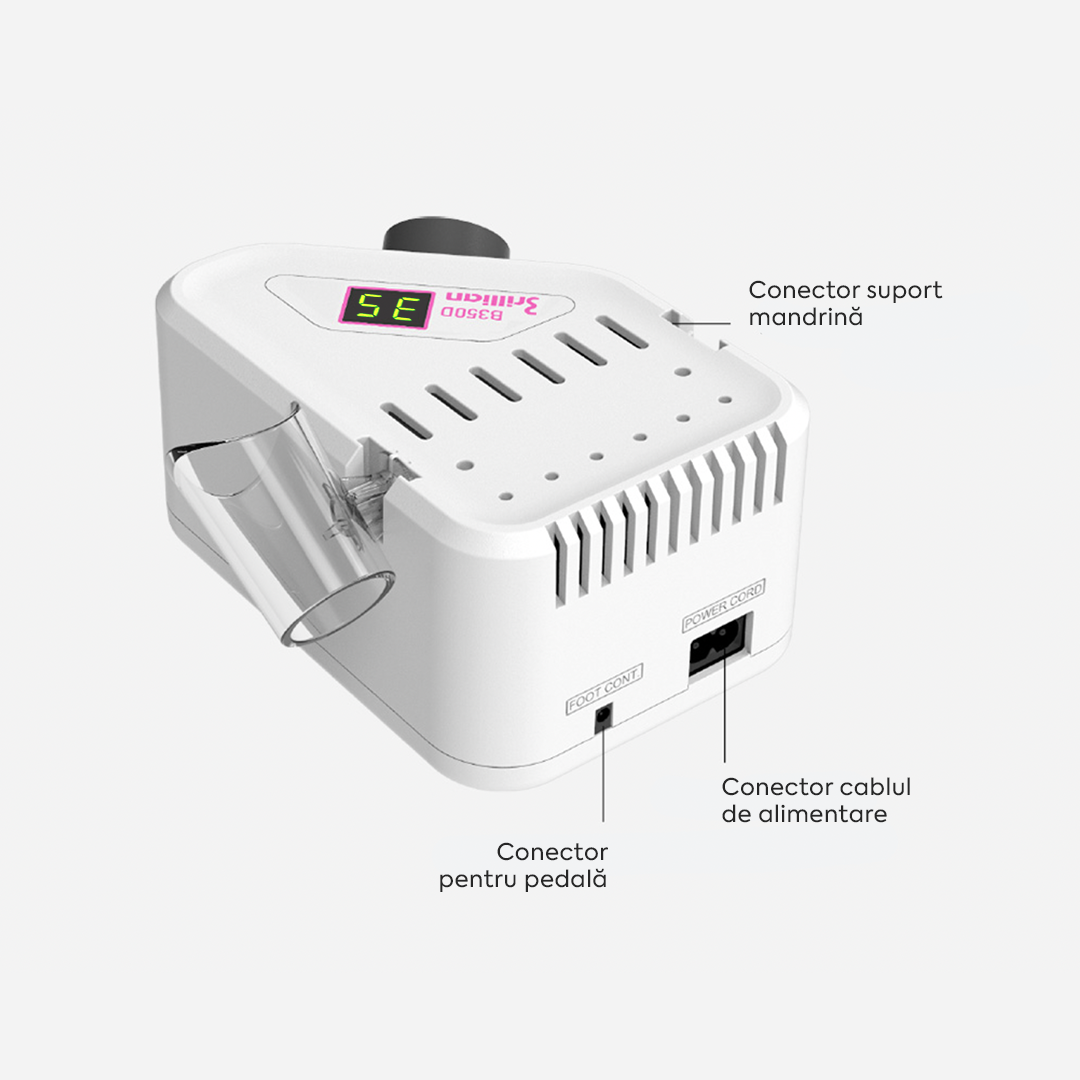 Mandrină H350 cu cuplu mare – oferă o turație de până la 35.000 RPM și un cuplu de 3.0 Ncm, suficient de puternic pentru procedurile de manichiură și pedichiură, dar fără a compromite confortul;