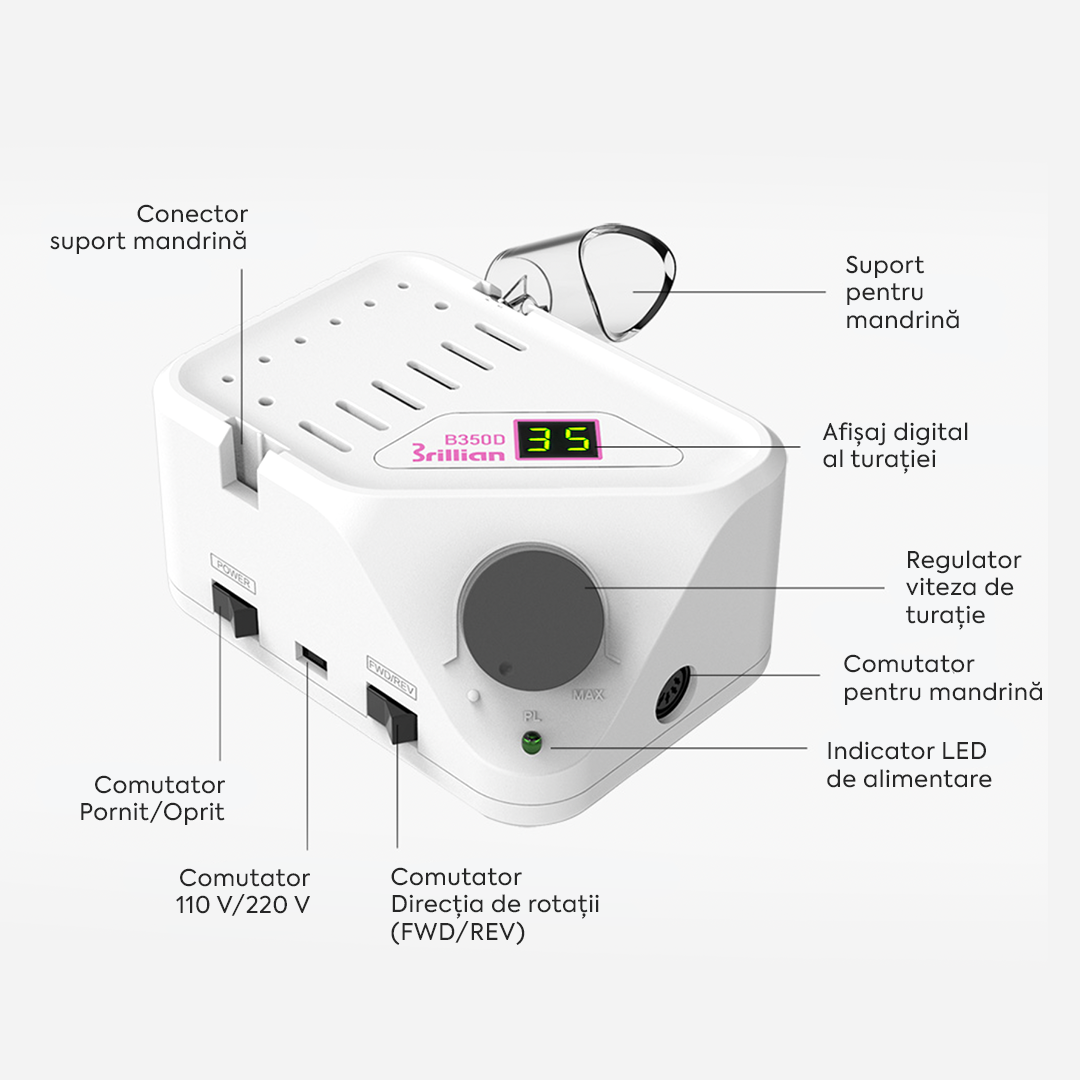 Freza electrică pentru manichiură și pedichiură Brillian B350D este versiunea modernă și actualizată a modelului B350, concepută cu funcții avansate pentru a spori controlul și confortul în timpul procedurilor. Freza este dotată cu ecran digital, motor silențios și mandrină ergonomică H350. Cu o viteză de până la 35.000 RPM și funcționare cu vibrații reduse, aceasta asigură precizie și eficiență în utilizarea îndelungată.
