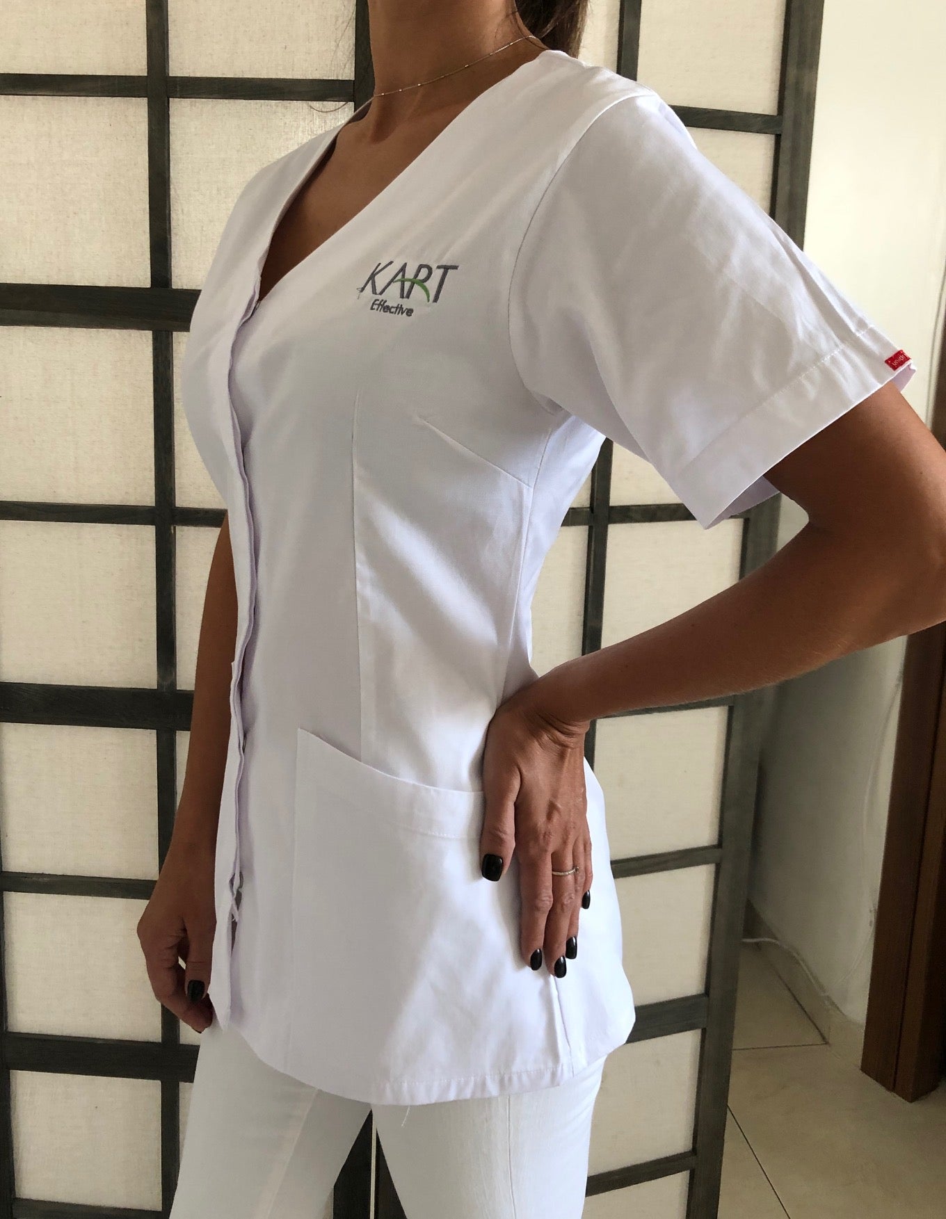 Halat confortabil și practic, creat special pentru tehnicienii de manichiură și pedichiură, cu logo-ul KART. Este realizat dintr-un material durabil, respirabil, care nu provoacă disconfort în timpul lucrului. Țesătura este folosită în croitoria îmbrăcămintei medicale.Suprafața exterioară este netedă și rezistentă la contaminare. Componenta sa din bumbac oferă senzația de confort. Țesătura medicală suportă bine spălările multiple/regulate (sterilizarea), își păstrează culoarea și nu necesită îngrijire specială. Articolul este rezistent la șifonare și este ușor de călcat, păstrându-și aspectul o perioadă îndelungată.