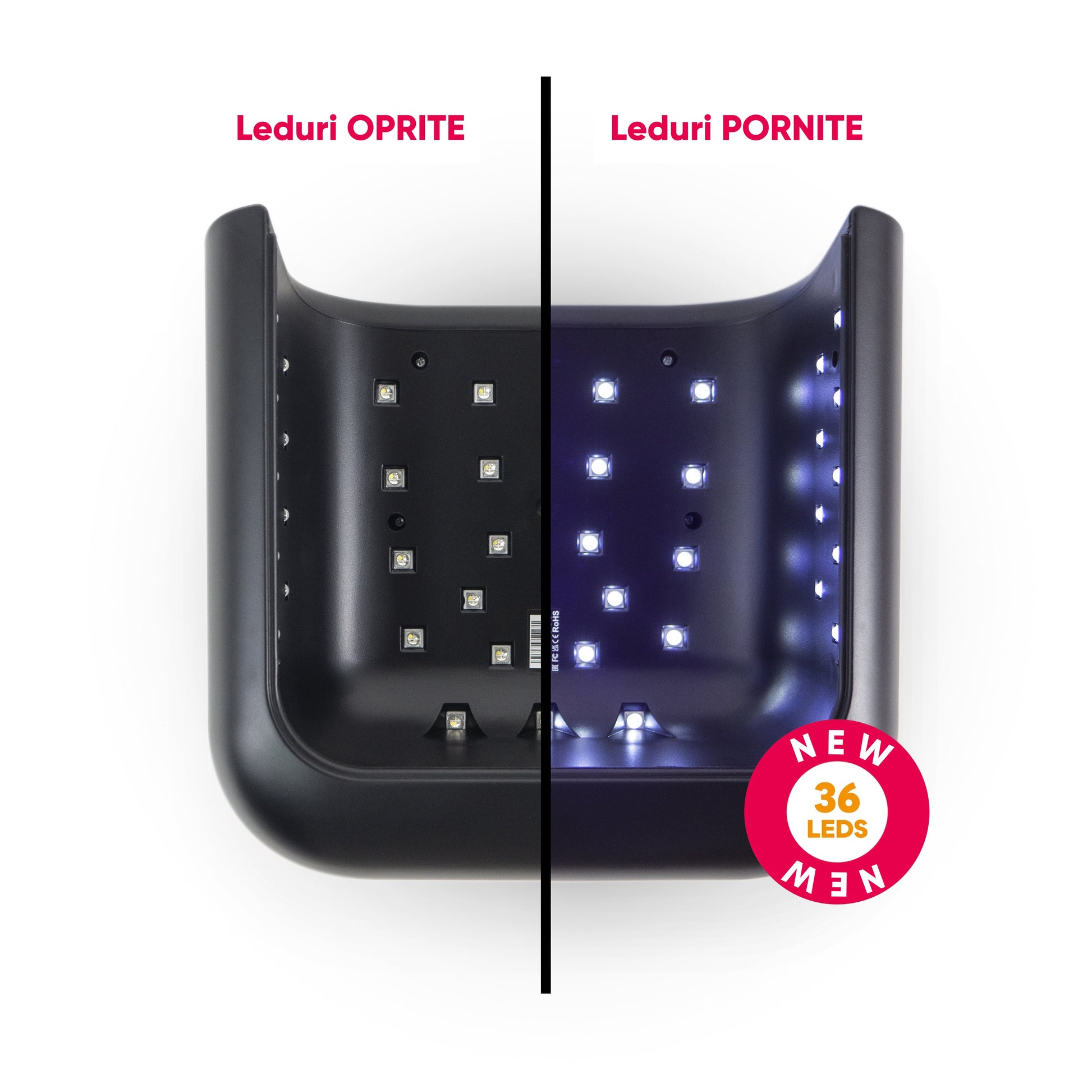 Este ideală, atât acasă, cât și la salon. Durata de viață a celor 39 de LED-uri este de 50000h. Forma încăpătoare a acesteia face lucrul mai ușor, având destul spațiu pentru a polimeriza 5 unghii simultan, atât în cazul pedichiurii, cât și în cazul manichiurii. Comparativ cu lampa de unghii cu lumină violetă tradițională, aceste lumini albe moi nu dăunează ochilor. Designul exterior al lămpii combină metalul mat și plasticul alb, iar în interiorul lămpii există un strat întunecat. O astfel de soluție contrastantă în culori și materiale oferă un aspect solid, pe care profesioniștii îl vor aprecia, precum și funcționalitatea unei baze detașabile din plastic. Pe lângă asta, lampa dispune în partea frontală și de un display digital cu temporizator.