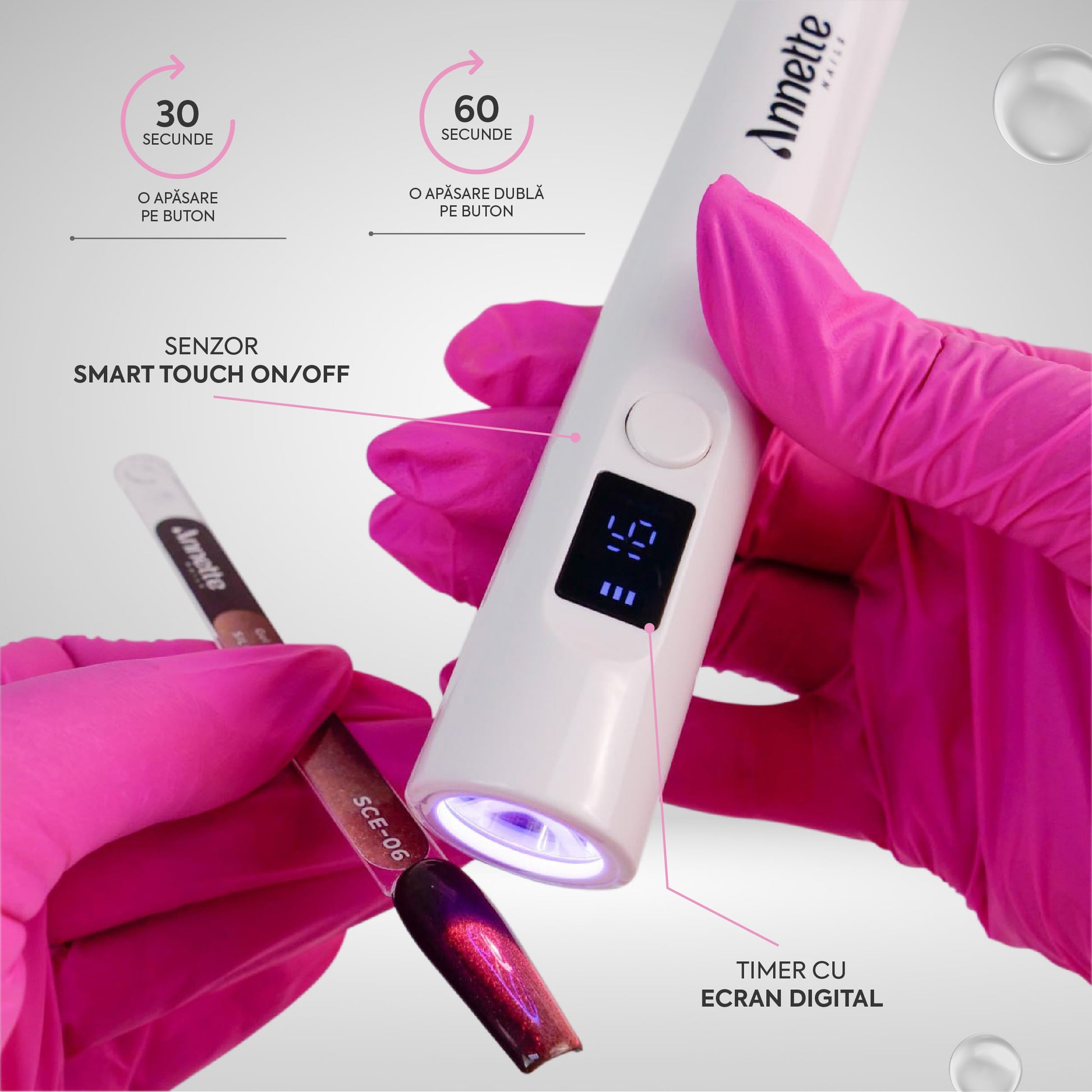 Lampa UV Mini Annette Nails emite o combinație optimă între raze UV și lumină infraroșie. Lumina infraroșie oferă un beneficiu suplimentar important: protejează pielea împotriva efectelor dăunătoare, prevenind îmbătrânirea prematură. Această funcție face ca lampa să fie ideală pentru utilizări frecvente, oferind nu doar polimerizarea rapidă și eficientă a materialelor pentru unghii, ci și protecție suplimentară pentru pielea din jurul unghiilor, menținând-o sănătoasă și tânără pe termen lung.