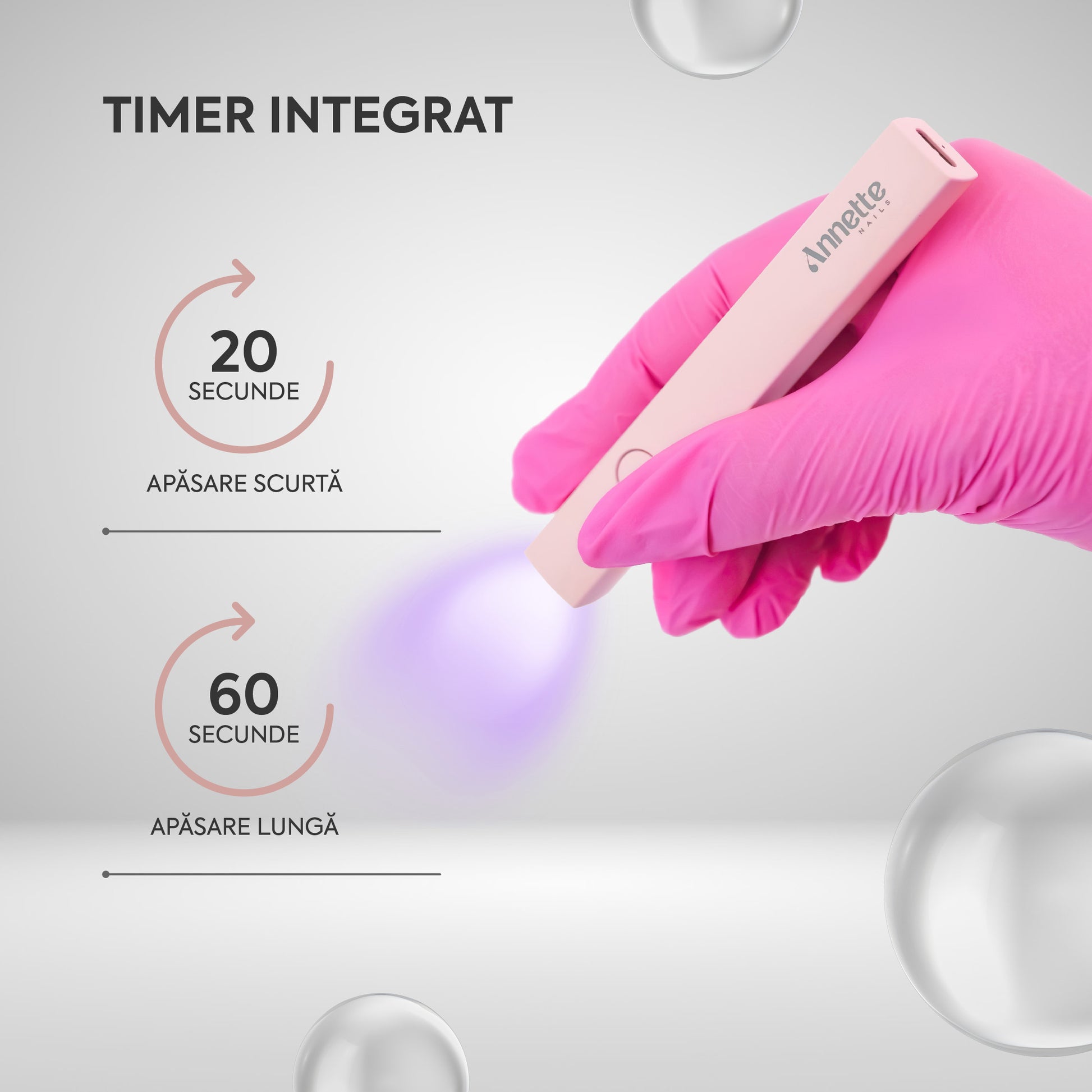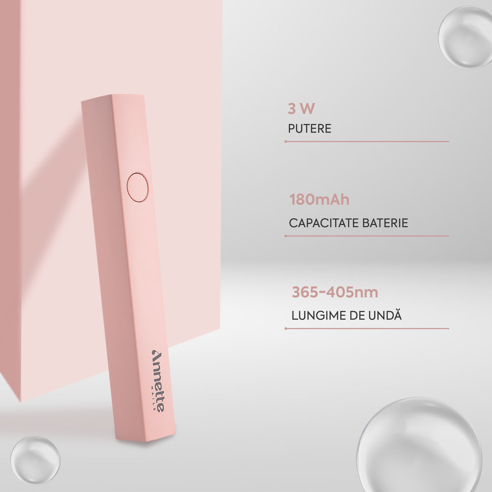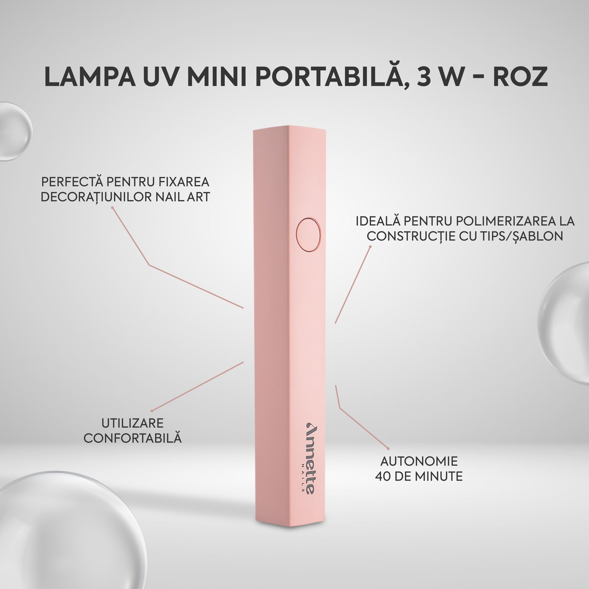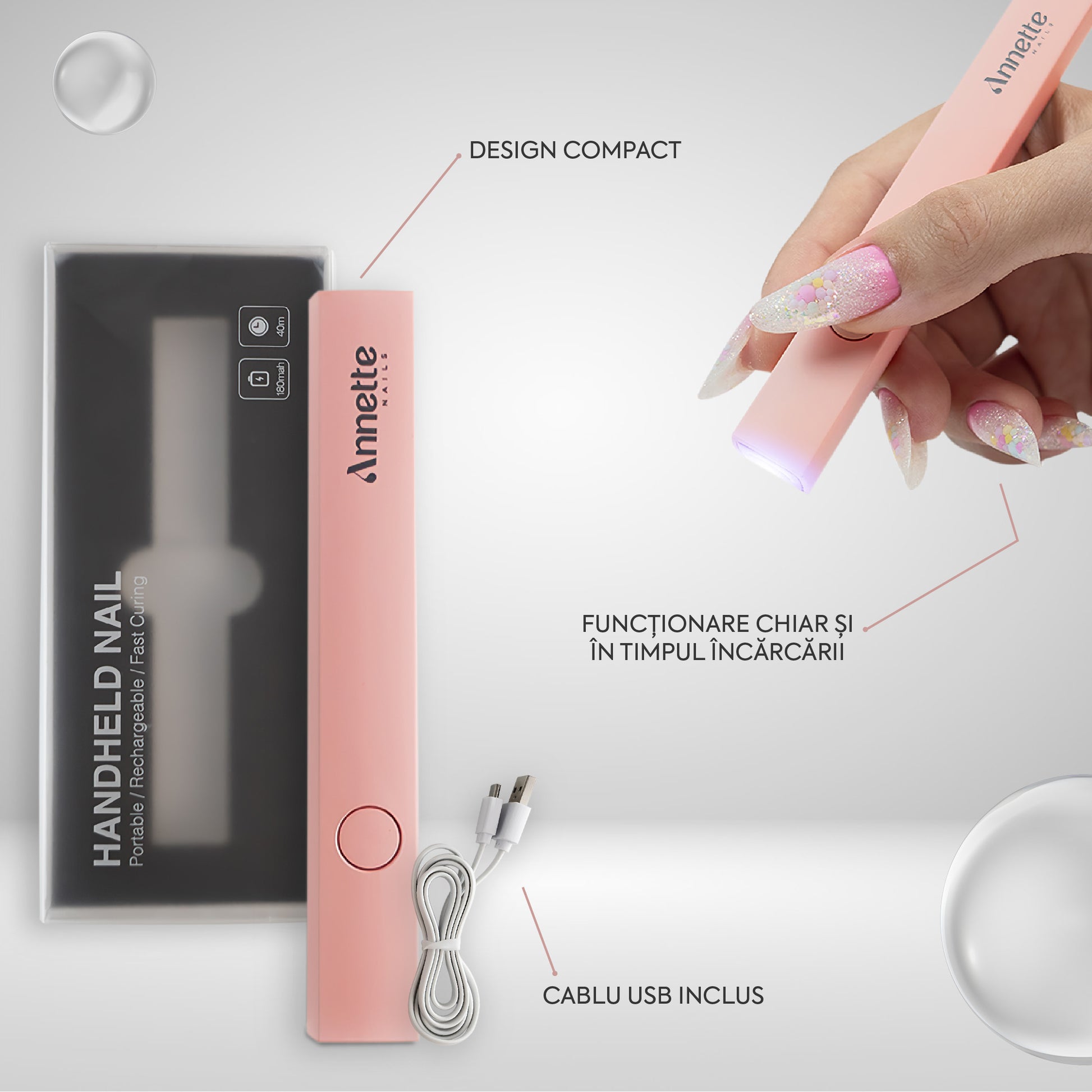 Lampa UV Mini Portabilă Annette Nails este potrivită pentru polimerizarea parțială a polygelui, acrygelului și gelului în realizarea extensiei cu șablon sau a construcției în tips, dar și pentru fixarea decorațiunilor nail art și setarea detaliilor fine în manichiură și pedichiură.