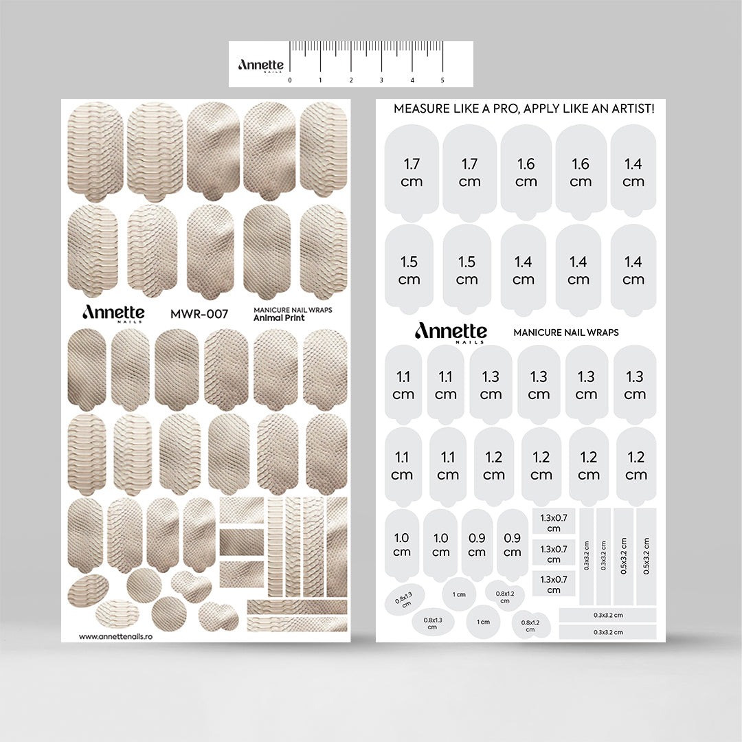 MWR-007 din colecția Nail Wraps Animal Print Annette Nails ilustrează textura autentică a pielii de șarpe, în nuanțe de nude și ivory. Fiecare wrap are un design individual, care se combină armonios cu celelalte, conturând un look fluid și echilibrat. În plus, pachetul conține decorațiuni care îți oferă libertatea de a adăuga accente originale și de a personaliza fiecare manichiură. Combinația cromatică între nude și ivory oferă un efect delicat și elegant, accentuând fiecare detaliu al designului, pentru un efect vizual memorabil.