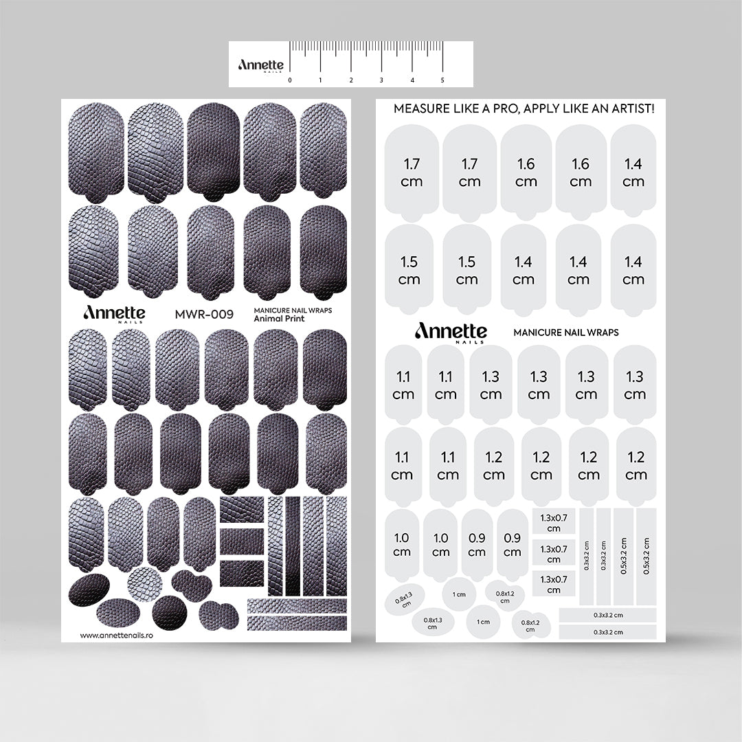 MWR-009 din colecția Nail Wraps Animal Print Annette Nails ilustrează textura autentică a pielii de șarpe, reinterpretată în nuanțe intense de violet. Fiecare wrap are un design individual, care se combină armonios cu celelalte, conturând un look fluid și echilibrat. În plus, pachetul conține decorațiuni care îți oferă libertatea de a adăuga accente originale și de a personaliza fiecare manichiură. Cromatica în nuanțe de violet închis oferă un efect dramatic și elegant, accentuând fiecare detaliu al designului, pentru un efect vizual memorabil.