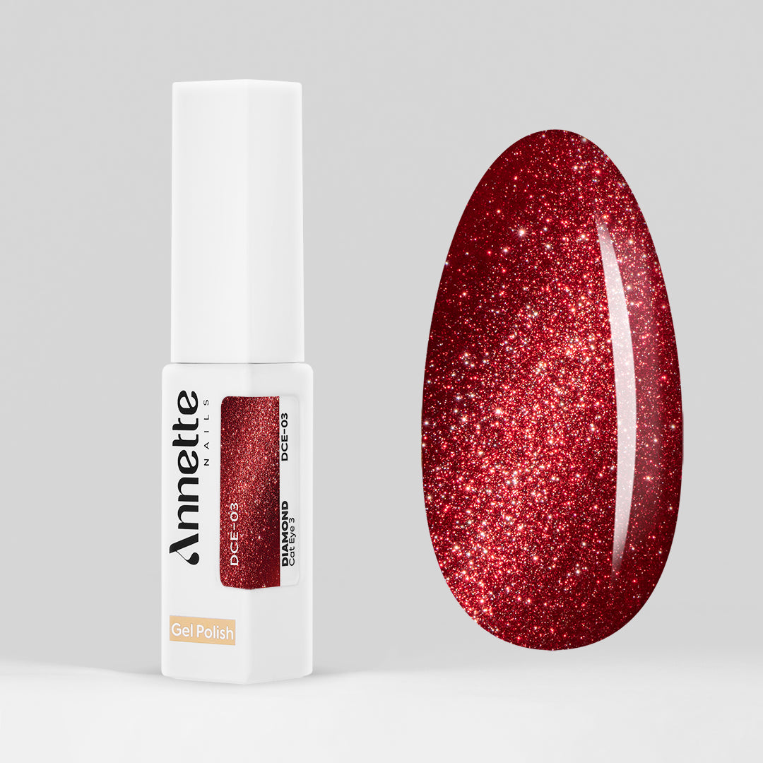 Colecția de oje semipermanente Diamond Cat Eye Annette Nails este alegerea ideală pentru tehnicienii care doresc să creeze manichiuri spectaculoase, cu un impact vizual puternic, dar ușor de realizat. Versiunea îmbunătățită a clasicului Cat Eye conține o cantitate mare de particule magnetice ultra-fine, combinate cu pigmenți cu reflexii diamantate, care oferă un efect Cat Eye bogat și strălucitor.Colecția Diamond Cat Eye cuprinde o paletă variată de nuanțe intense și vibrante, inspirate de eleganța și profunzimea pietrelor prețioase. Acestea pot fi folosite în look-uri full cat eye, french reinventat sau designuri negative space. Se potrivesc perfect atât în manichiuri de zi cu zi, cât și în cele pentru evenimente speciale – o opțiune versatilă care adaugă profunzime, strălucire și un efect magnetic deosebit.