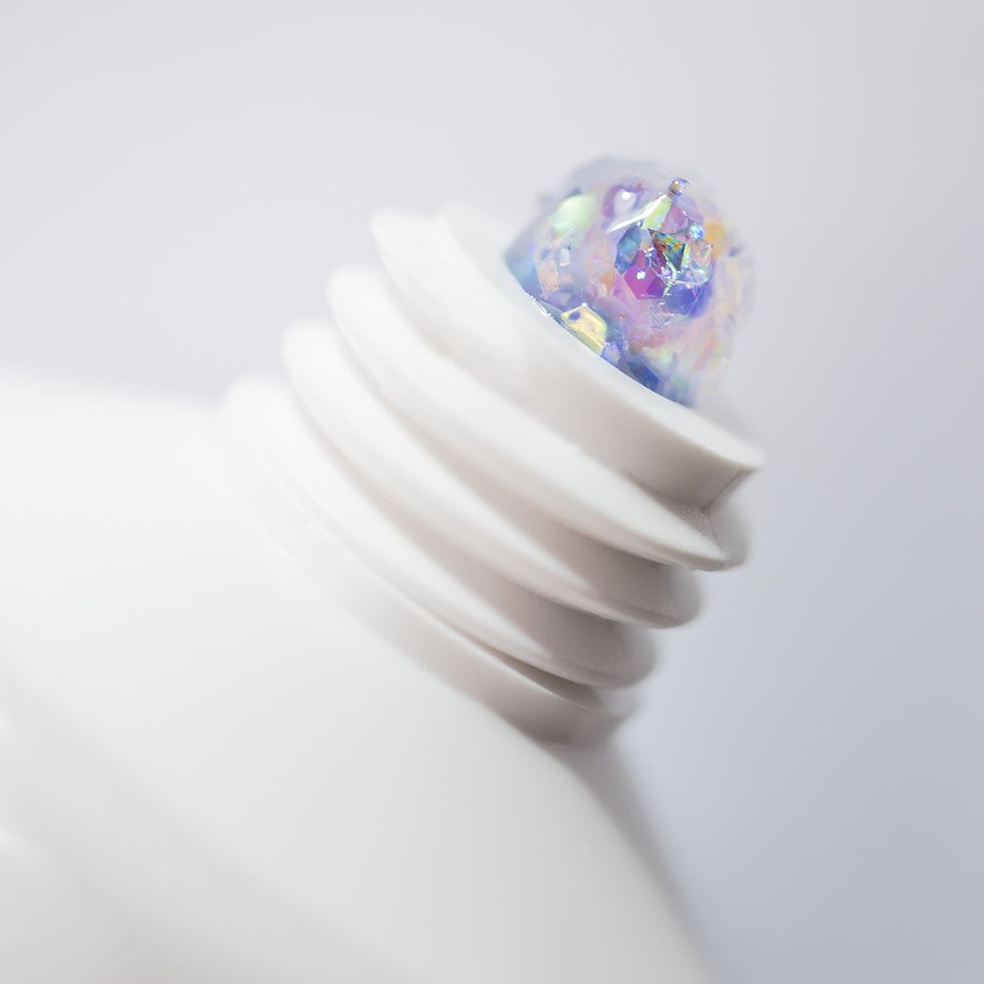 Glitter 51: Polygel transparent, cu inserții de confetti ce reflectă lumina muticolor, ideal pentru obținerea unei manichiuri french glass nonconformiste.