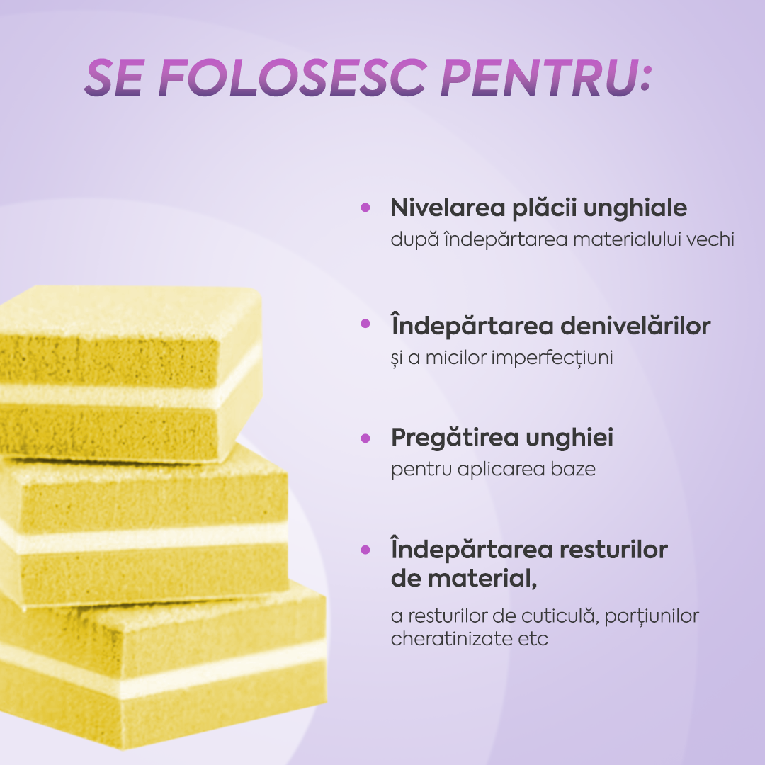Abrazivitatea de 100 grit este ideală pentru șlefuirea suprafeței unghiei tehnice, îndepărtarea denivelărilor și corecțiile după îndepărtarea stratului vechi de produs.