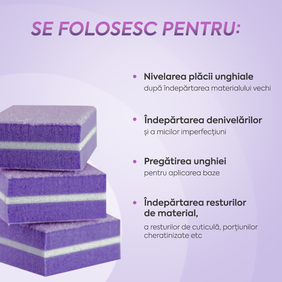 Abrazivitatea de 100 grit este ideală pentru șlefuirea suprafeței unghiei tehnice, îndepărtarea denivelărilor și corecțiile după îndepărtarea stratului vechi de produs.