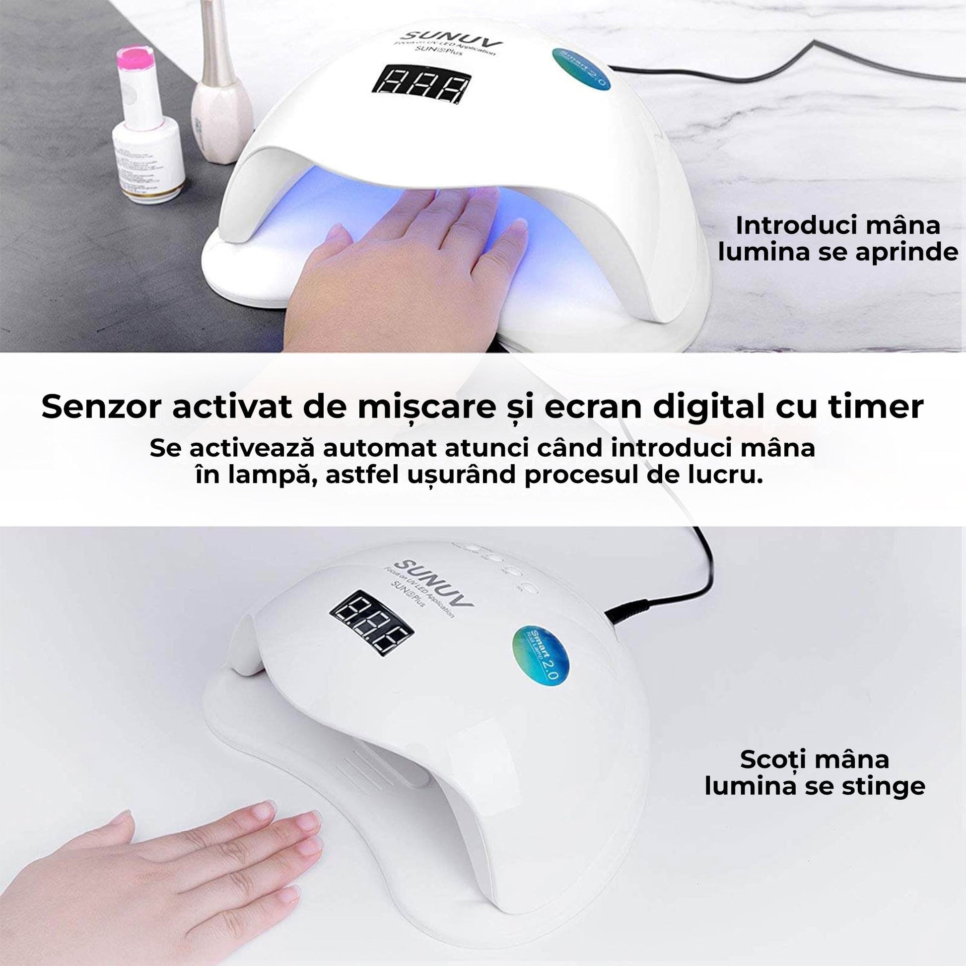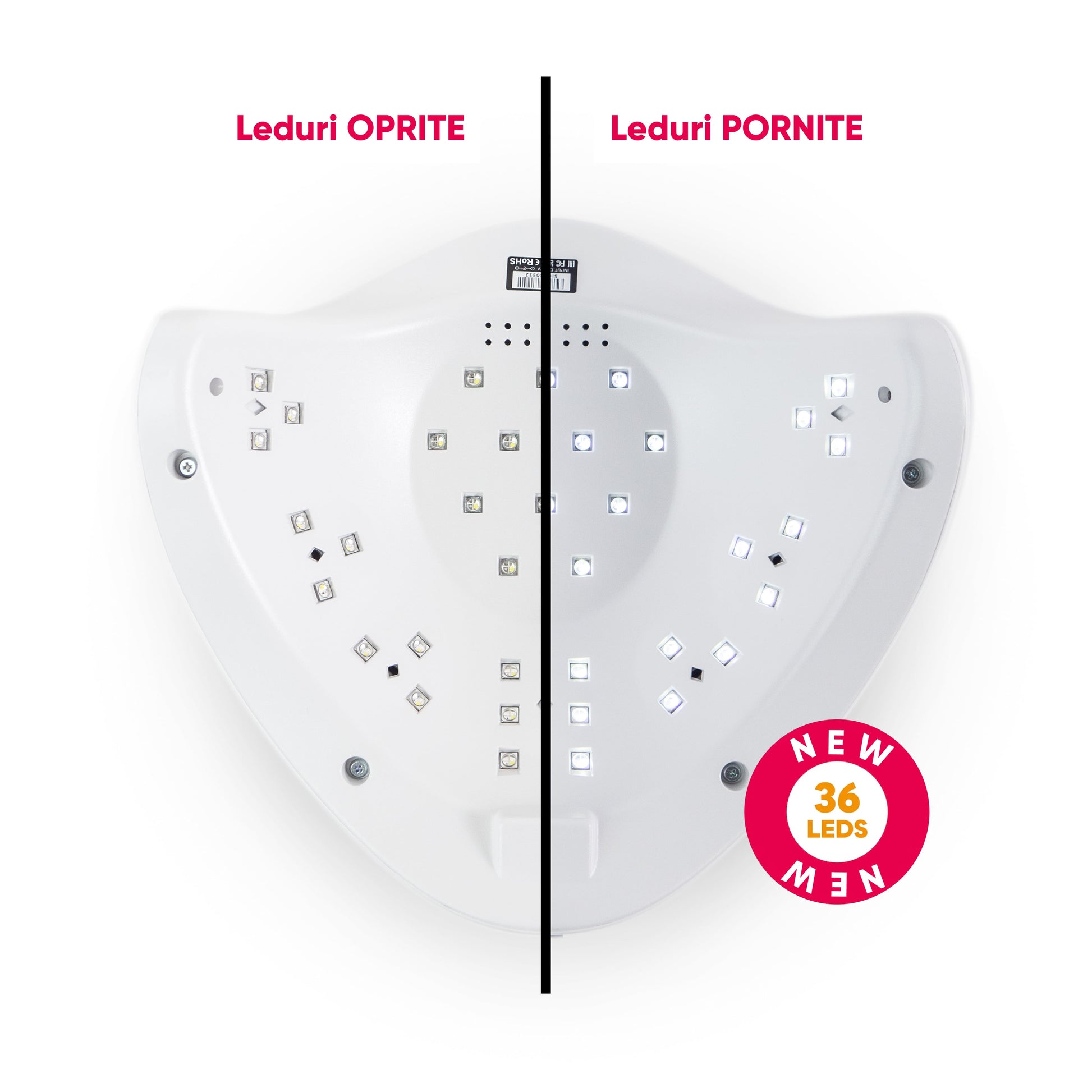Cele 36 de LED-uri sunt distribuite uniform în interiorul lămpii, ceea ce asigură polimerizarea întregii suprafețe a plăcii unghiale, atât pentru manichiură, cât și pentru pedichiură.