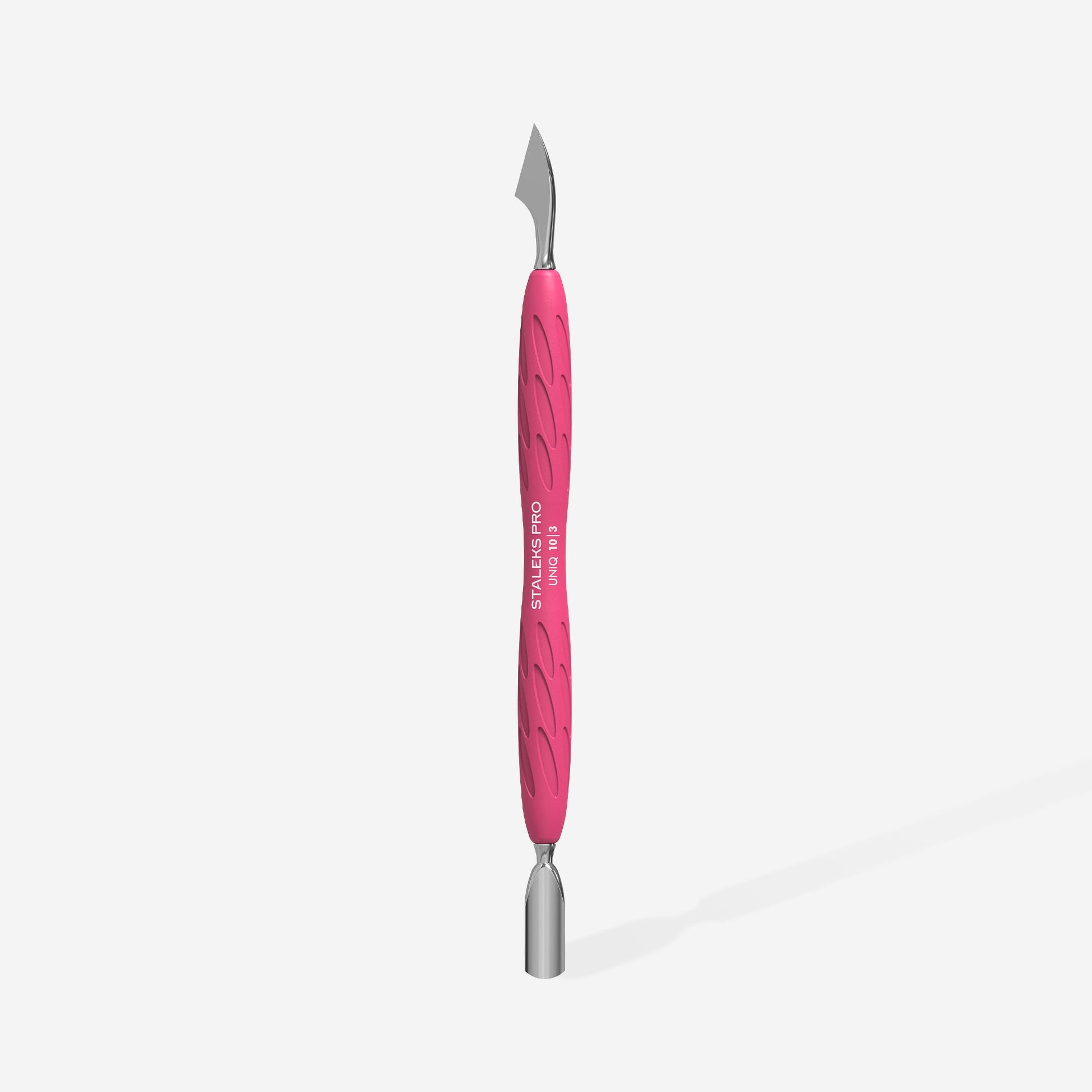 Pusherul Staleks PQ-10/3, cu capăt rotunjit și lamă ascuțită, este utilizat în manichiură și pedichiură pentru a ridica și a împinge cuticula în vederea îndepărtării acesteia și pentru a curăța placa unghială de excrescențe ale pielii. Combinația dintre capetele metalice din oțel inoxidabil și mânerul din silicon hipoalergenic, cu design anti-alunecare, conferă tehnicienilor confort și funcționalitate în utilizare.