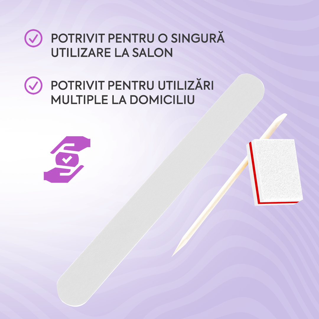 Setul de manichiură AnnetteNails se poate folosi atât în pilirea și pregătirea unghiilor naturale, cât și în finisarea unghiilor tehnice.
