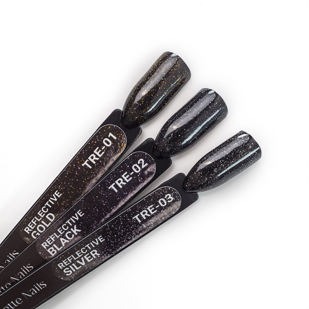 Reflective silver no wipe - este un top coat decorativ, fără strat de dispersie, ce conține particule de sclipici argintiu reflectorizant. Acestea oferă manichiurii o strălucire spectaculoasă când este expusă la o sursă puternică de lumină. Se poate aplica, atât peste nuanțele închise, cât și pe cele deschise sau peste french. Are o consistență medie și se autonivelează rapid în procesul aplicării. Își păstrează luciul pe toată durata purtării manichiurii.