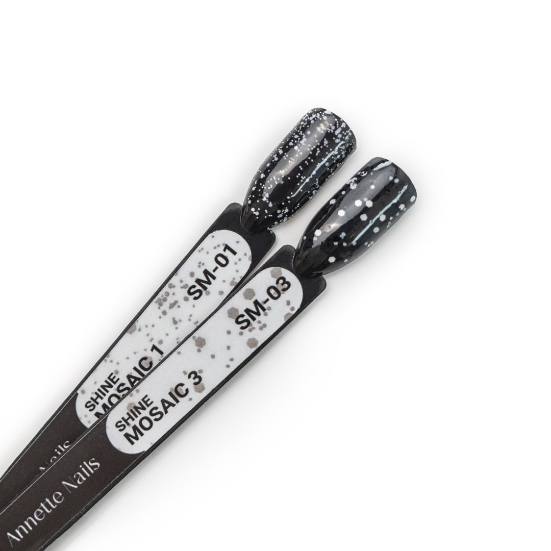 Shine Mosaic 1 no wipe - este un top coat decorativ, fără strat de dispersie, ce conține o cantitate mare de paiete decorative negre și albe, de diferite mărimi. Conferă manichiurii un efect deosebit. Se recomandă aplicarea peste culori deschise. Are o consistență medie și se autonivelează rapid în pocesul aplicării. Își păstrează luciul pe toată durata purtării manichiurii.